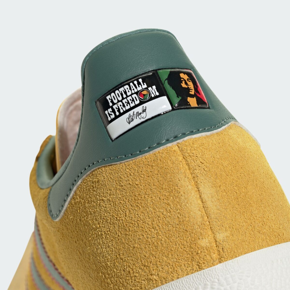 Дизайн пропитан растафарианскими мотивами: культовые три полоски выполнены в приглушенном зеленом цвете с тонкой красной окантовкой. На пятке из бирюзовой кожи (Teal leather) расположено рельефное тиснение с именем музыканта и фразой “Football Is Freedom”. Внутренняя отделка насыщенного красного цвета дополняет общую палитру, превращая кроссовки в настоящий культурный артефакт.