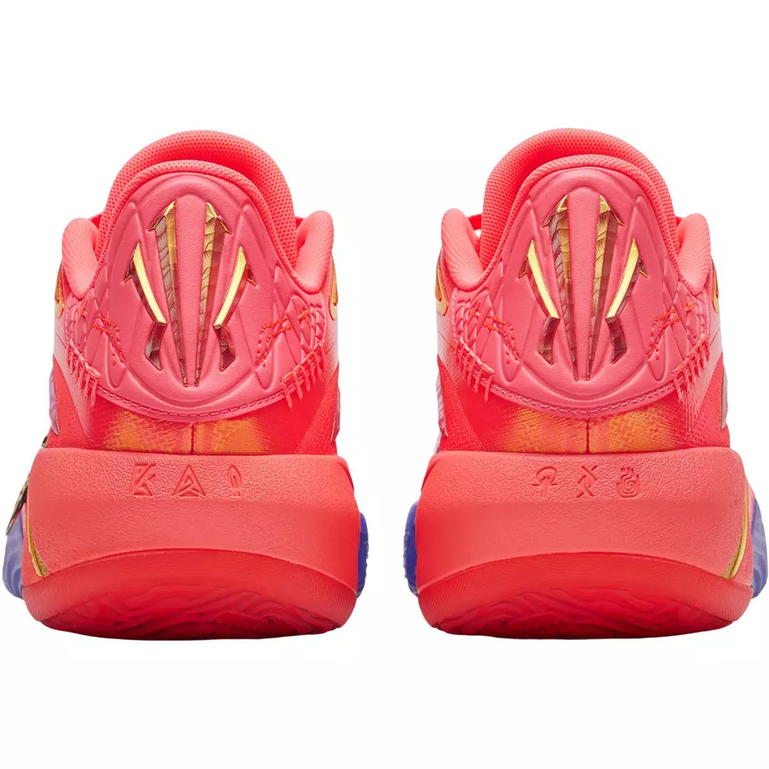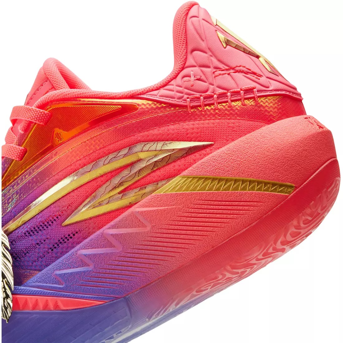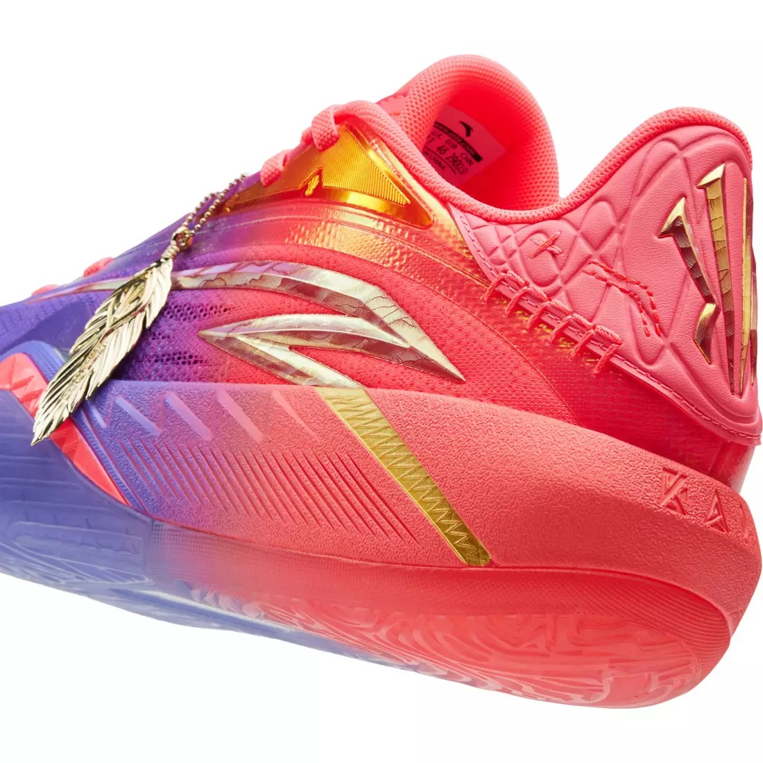 Внешний вид кроссовок поражает градиентным исполнением, которое несет в себе глубокий смысл. Передняя часть стопы окрашена в насыщенный фиолетовый цвет, олицетворяющий максимальную концентрацию и тишину перед решающим броском. К пятке цвет плавно переходит в розовый, символизирующий процесс восстановления и остроту ума. Завершают образ металлические золотые акценты на логотипах и подписи Кайри, отсылающие к форме камертонов.