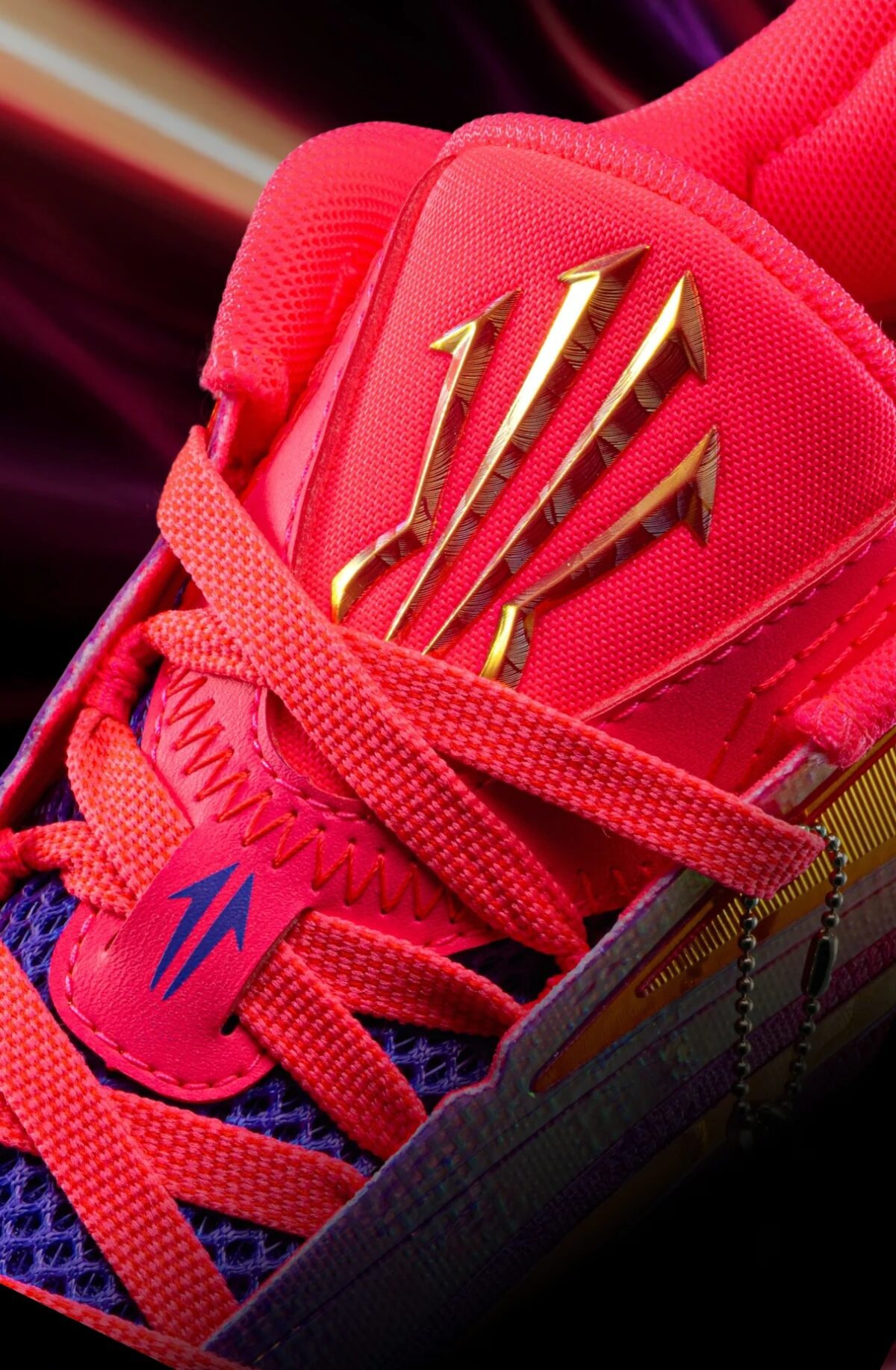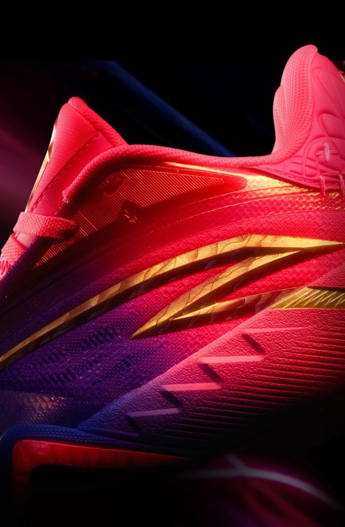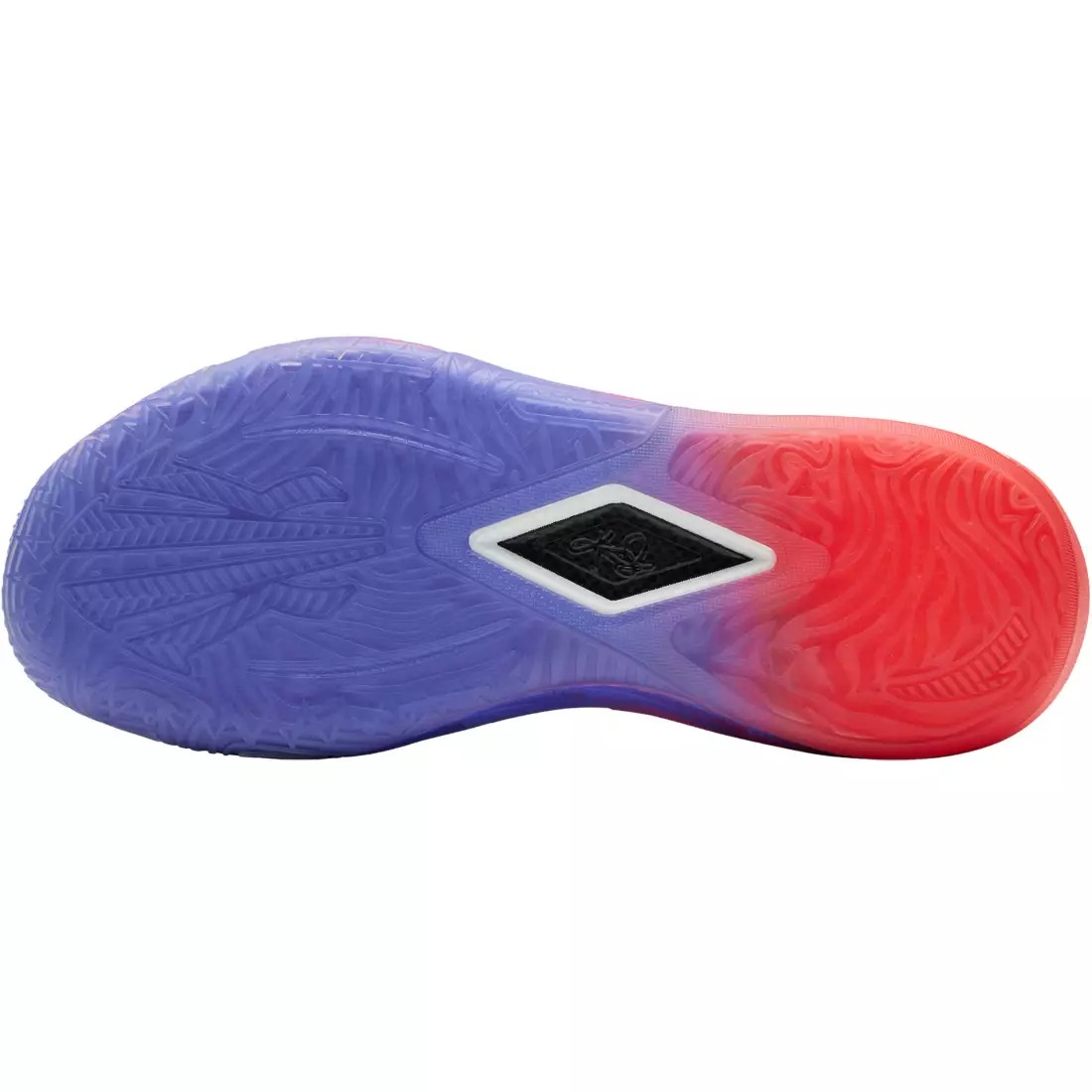 Внешний вид кроссовок поражает градиентным исполнением, которое несет в себе глубокий смысл. Передняя часть стопы окрашена в насыщенный фиолетовый цвет, олицетворяющий максимальную концентрацию и тишину перед решающим броском. К пятке цвет плавно переходит в розовый, символизирующий процесс восстановления и остроту ума. Завершают образ металлические золотые акценты на логотипах и подписи Кайри, отсылающие к форме камертонов.
