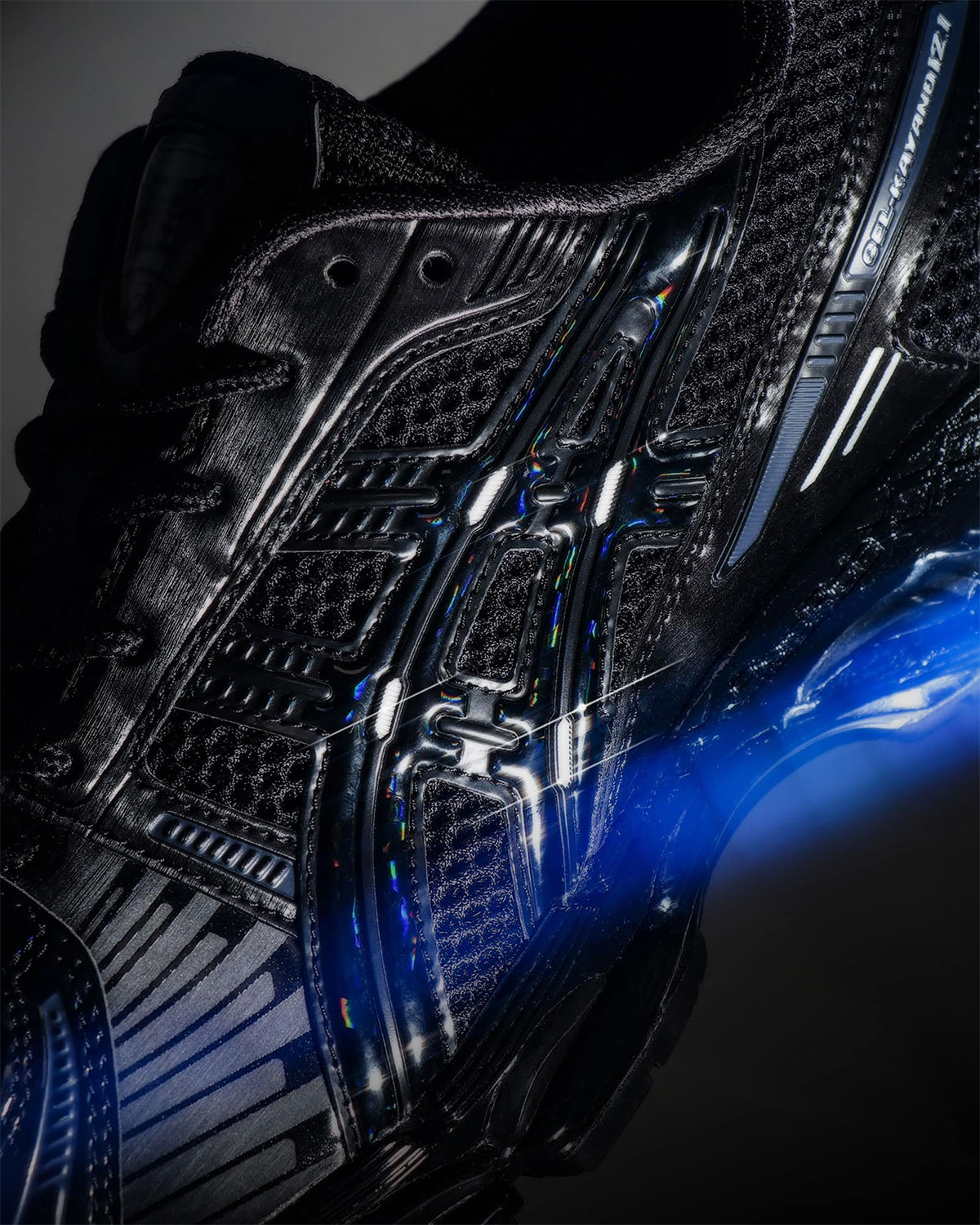 Визуальная концепция модели строится на контрасте глубокого черного цвета и мистического сияния. Верх кроссовка выполнен из сочетания технологичной сетки и глянцевой лакированной кожи. Главным акцентом стали боковые панели, имитирующие эффект натурального перламутра. Под разными углами освещения эти детали переливаются радужными и синими оттенками, создавая иридисцентный блеск, который отсылает к работам мастеров Sagaraden из Киото.