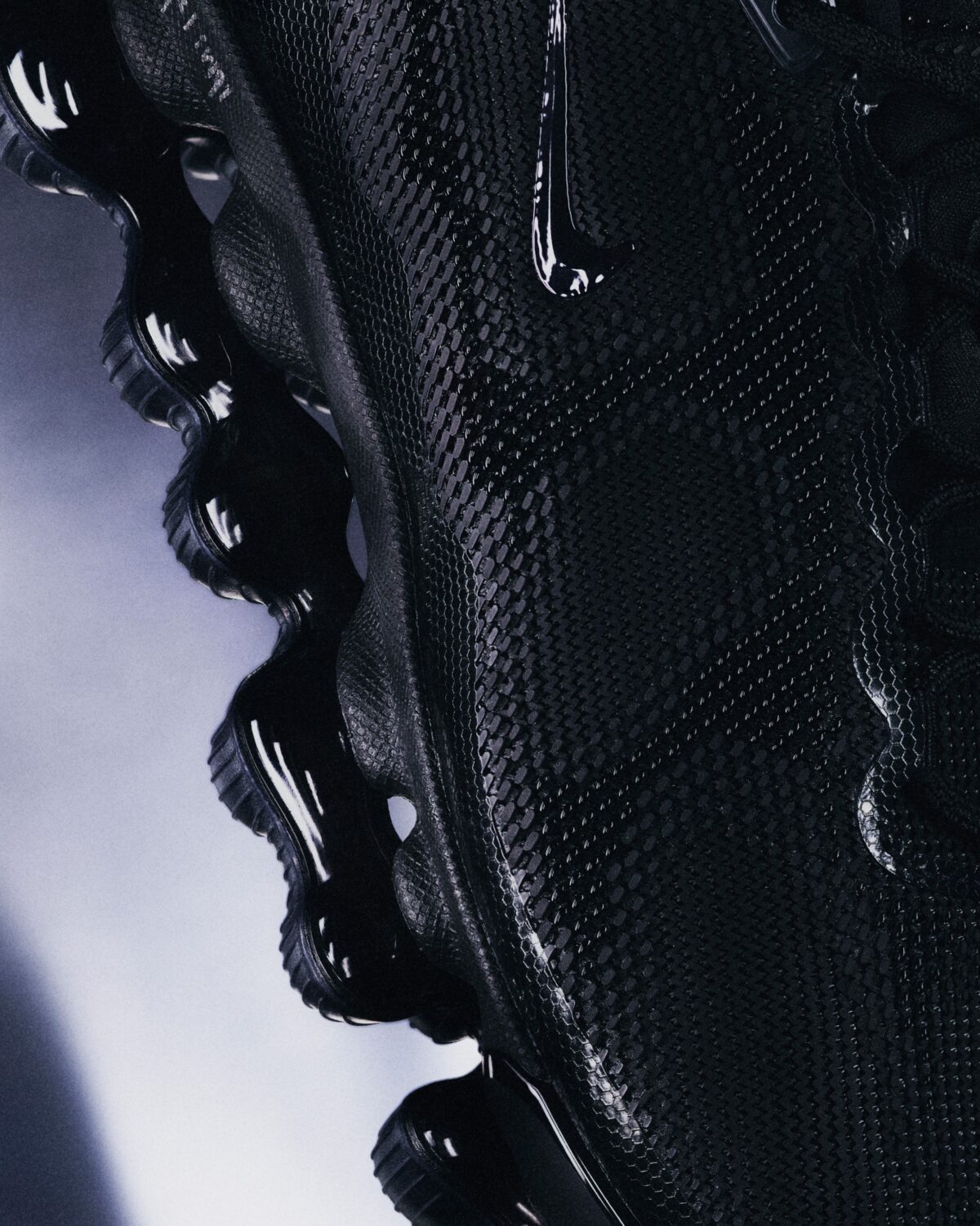 Верх кроссовок выполнен из текстурированного сетчатого материала с применением трехслойной печати. Глянцевый эффект и переливы темных тонов создают визуальную глубину, вдохновленную кожей ядовитой лягушки. Это биологическое влияние прослеживается и в «расплавленной» форме подошвы, которая плавно перетекает в футуристичный корпус, стирая границы между органическими формами и спортивными технологиями будущего.