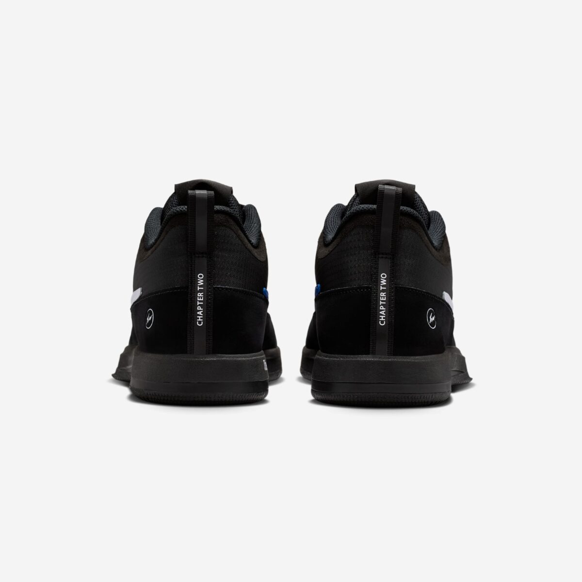 Верх модели выполнен из комбинации нейлона и замшевых панелей, которые плавно переходят от мыска к пятке. Использование текстурированной темно-серой сетки создает визуальный контраст, отсылая к архивам Nike. Ключевой особенностью дизайна является асимметричное исполнение: классический белый логотип Swoosh расположен на внешней стороне, в то время как медиальную часть украшает фирменный ярко-синий «свуш» в стиле Fragment.