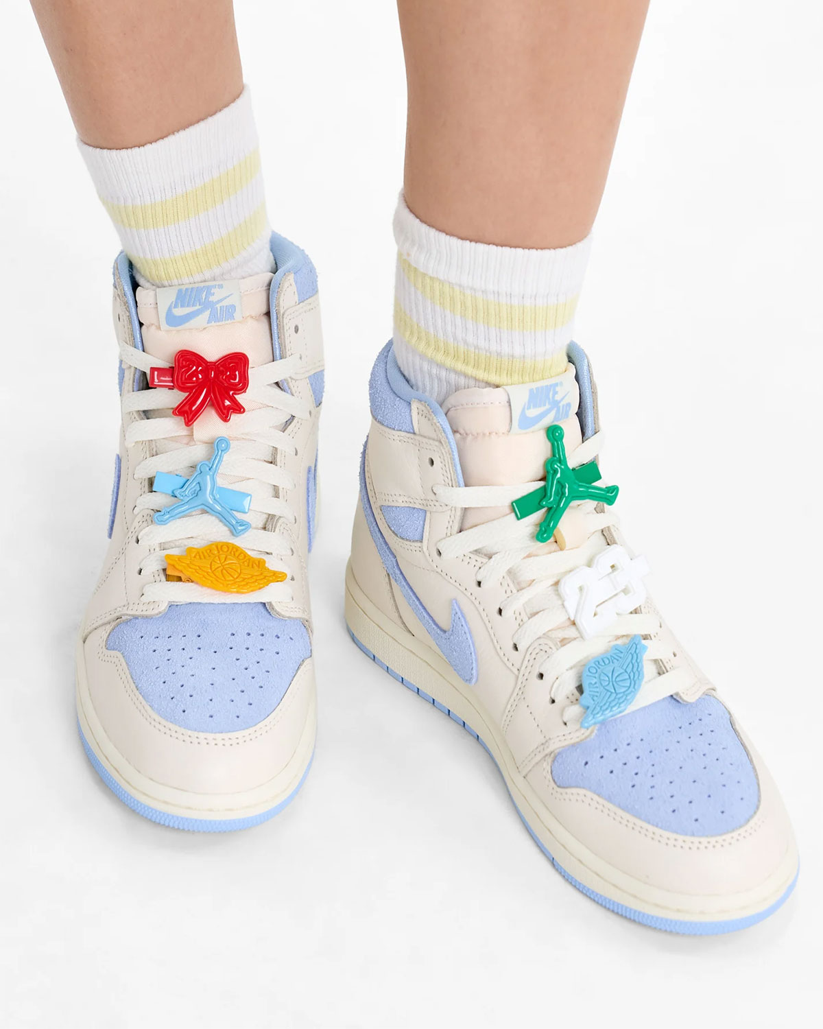 Главной особенностью данного релиза стали съемные шармы (lace charms) на шнурках. Этот декоративный элемент позволяет кастомизировать обувь под свой стиль, добавляя паре налет эксклюзивности, который обычно присущ лимитированным коллаборациям. Такая деталь подчеркивает ориентацию модели на fashion-аудиторию и современную уличную моду.
