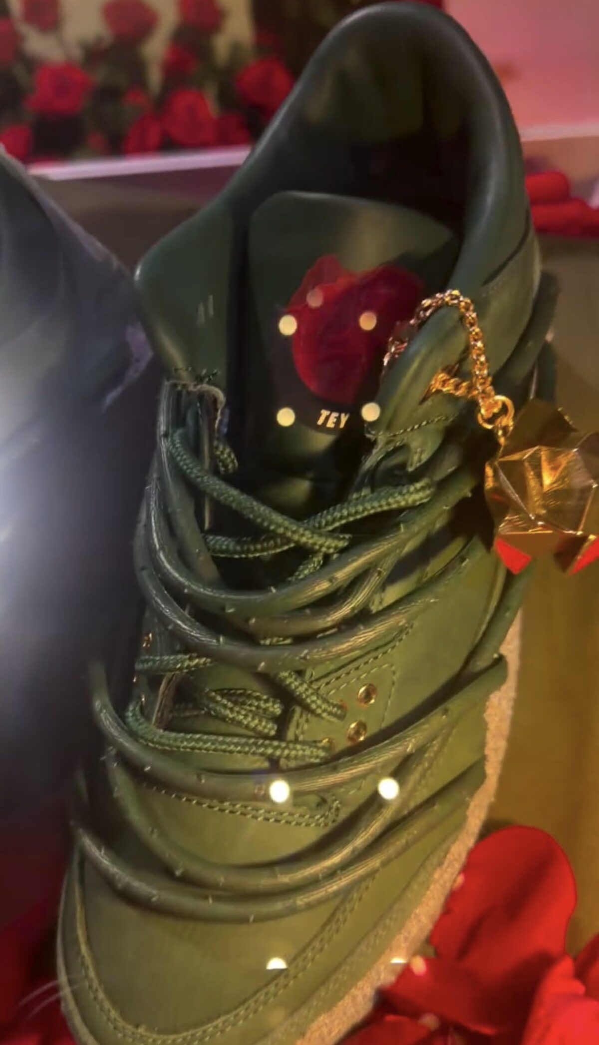 Золотистые элементы Metallic Gold на люверсах и фурнитуре добавляют образу изысканности, символизируя успех и возвышение. Брендинг также подчеркивает статус коллаборации: на язычке красуется буква «T», а пятку украшает классический логотип Nike Air, отдающий дань уважения наследию бренда. Финальным штрихом служит роскошная золотая бирка-брелок в форме розы.
