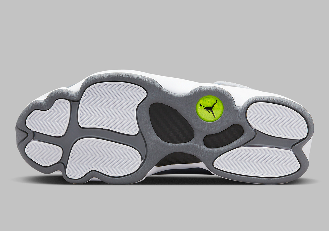 Нижняя часть кроссовка базируется на узнаваемой подошве Air Jordan 13 с ее характерным сегментированным протектором. В этой итерации подошва выполнена в сером цвете, гармонируя с белоснежной мидсолью. Особое внимание привлекает голографический элемент в виде «глаза пантеры» неонового зеленого цвета, расположенный на подметке, что добавляет модели аутентичности.