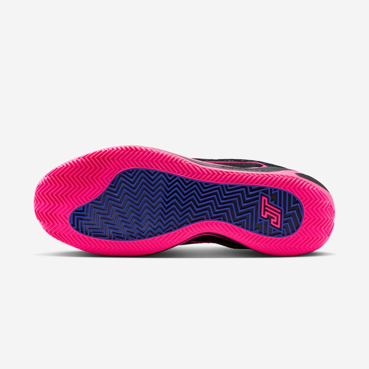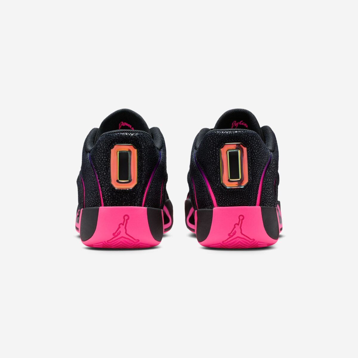 Внешний вид модели поражает своей смелостью. Основа выполнена из премиальной черной пебблированной кожи, которая придает кроссовкам текстурность и долговечность. Главный акцент сделан на динамичных градиентных панелях в оттенках Fierce Purple, Racer Blue и Hyper Pink. Эти неоновые переливы создают ощущение движения, плавно переходя к ярко-розовой подошве. Завершают образ черный замшевый язычок с персональным логотипом JT и контрастный золотой Jumpman на боковой панели.