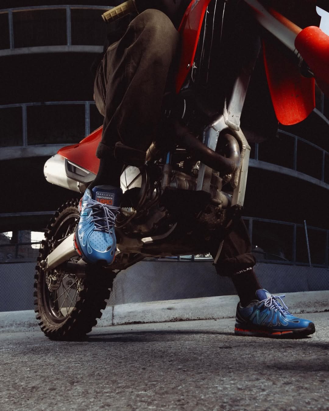 Внимание к деталям в этой паре поражает: холодные синие тона гармонично соседствуют с мятными логотипами и неоновыми вставками. Теплый оранжевый цвет на проушинах шнурков и пятке добавляет необходимый контраст нейтральной базе в оттенках Off-White. Завершают образ прочные веревочные шнурки в стиле outdoor-обуви, подчеркивающие аутентичный характер коллаборации Baklava.