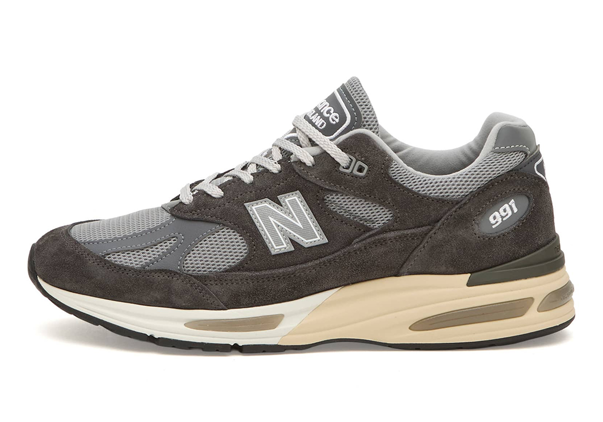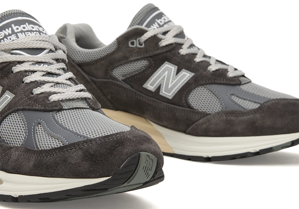 Верх модели традиционно выполнен из премиальной свиной замши (pigskin suede), которая дополняется вставками из дышащей сетки и синтетическими стабилизирующими элементами. Стримлайновый профиль модели стал более обтекаемым по сравнению с классической 991-й, что визуально сближает её с 992-м силуэтом. Тиснёный логотип «N» с деликатными линиями debossed и вышивка «v2» на язычке подчеркивают эксклюзивный статус пары, произведенной вручную в Англии.
