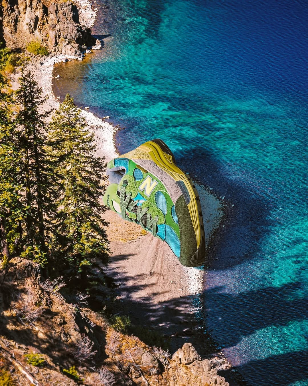 Цветовая палитра кроссовок черпает идеи из пейзажей национального парка Крейтер-Лейк. Глубокие синие оттенки символизируют водную гладь озера, а зеленые акценты отсылают к густым хвойным лесам, окружающим горный массив. По словам дизайнера, эта эстетика тесно связана с концепциями из его недавно опубликованной книги, отражая философию спокойствия и величия природы.