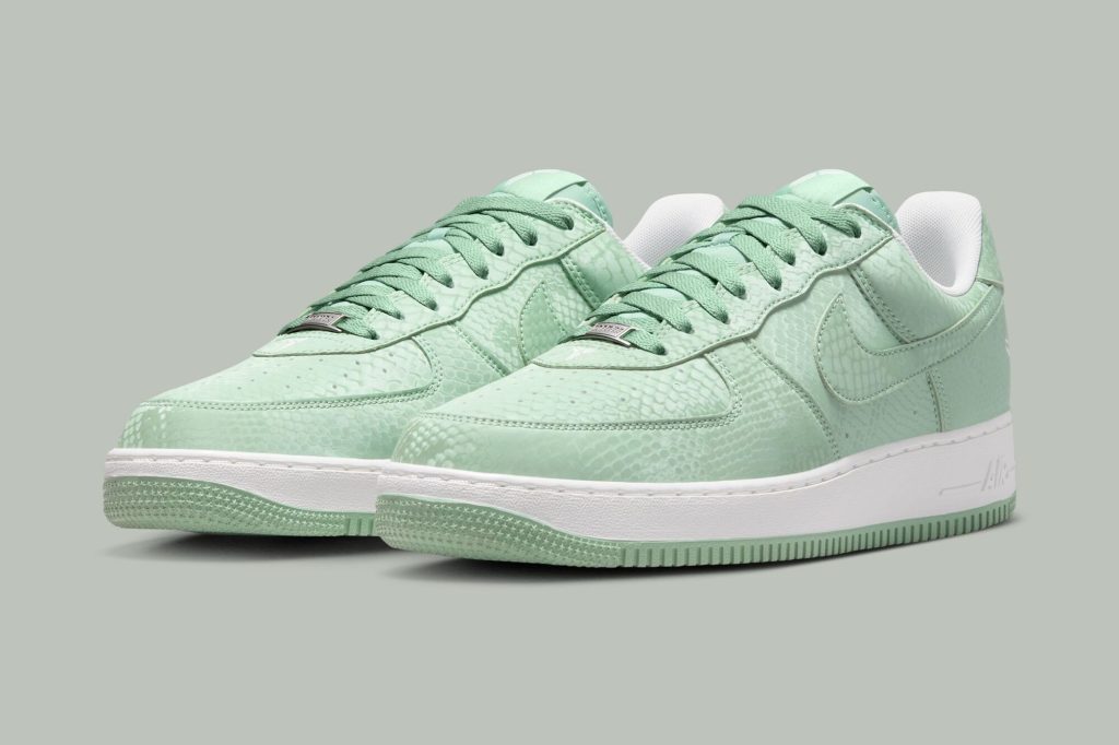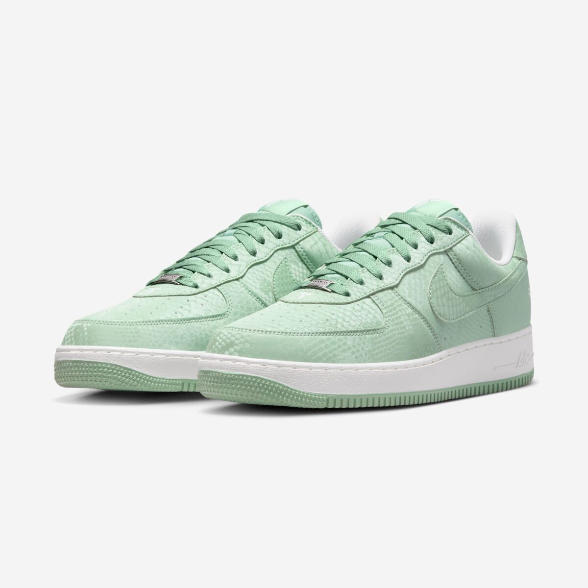 Цветовая гамма “Steam/Summit White” выделяется своей сдержанностью и элегантностью. Основная часть верха выполнена в мягком, приглушенном зеленом оттенке «Steam», который создает спокойный визуальный образ. Матовая отделка кожи гармонично контрастирует с белоснежными акцентами Summit White на логотипе Swoosh и заднике, что делает кроссовки универсальным дополнением к любому гардеробу.
