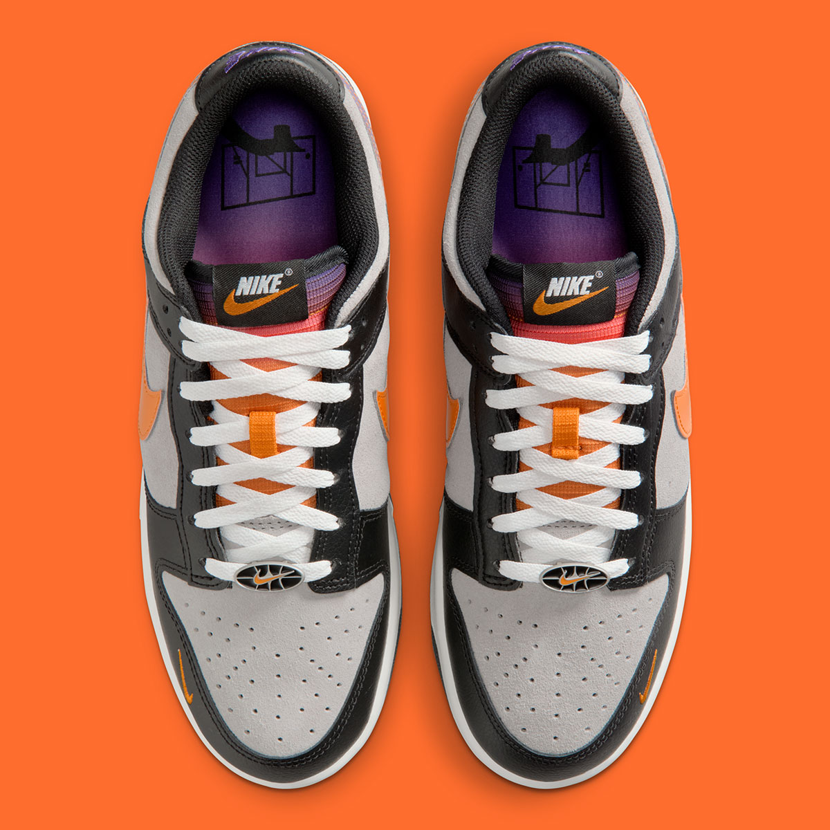Главной визуальной особенностью модели является градиент от ярко-оранжевого к насыщенному фиолетовому. Этот эффект «Sunset» нанесен на логотип Swoosh, язычок и стельки. Цветовая схема, включающая оттенки Orange Peel, Court Purple и Bright Mango, идеально передает атмосферу уходящего дня, создавая динамичный и запоминающийся образ, который выделяется на фоне классических расцветок.