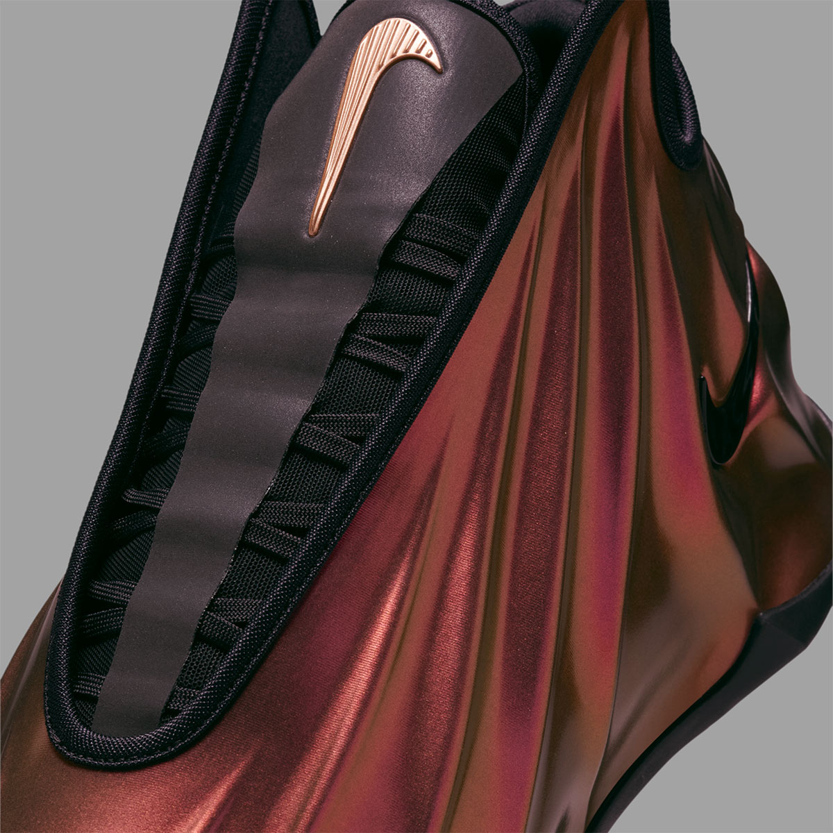 Цветовое решение «Metallic Red Bronze/Black» мгновенно притягивает взгляд своим глубоким медным сиянием. Литой верх кроссовок выполнен из инновационного глянцевого материала с эффектом смены оттенка, который переливается при движении, создавая динамичный визуальный образ. Этот «скульптурный панцирь» не только отсылает к классике, но и обеспечивает надежную фиксацию стопы. Черные контрастные элементы на язычке, подошве и брендинге добавляют модели строгости и глубины, уравновешивая яркий металлический блеск.