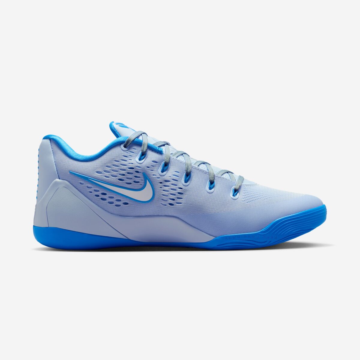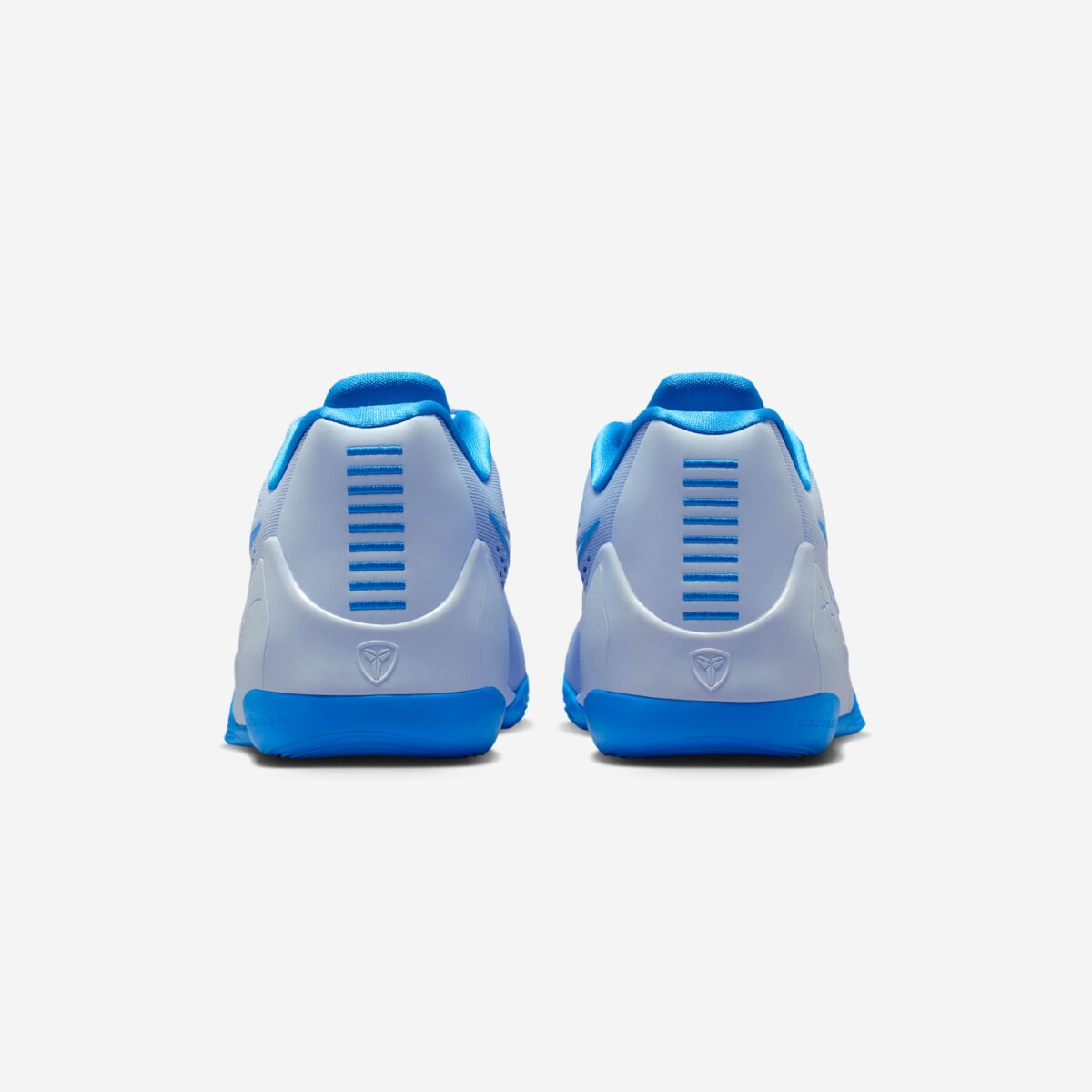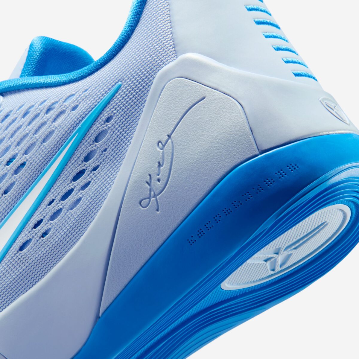 Цветовое решение «Hydrogen Blue» вдохновлено «ледяной» чистотой. Основной светло-голубой оттенок гармонично сочетается с белыми элементами мидсоли и яркими акцентами Light Photo Blue. Контрастный темно-синий цвет на аутсоле и внутренней подкладке завершает образ, придавая кроссовкам глубину. Этот дизайн лишен лишних декоративных элементов, полностью фокусируясь на функциональности и стиле эпохи «Black Mamba».