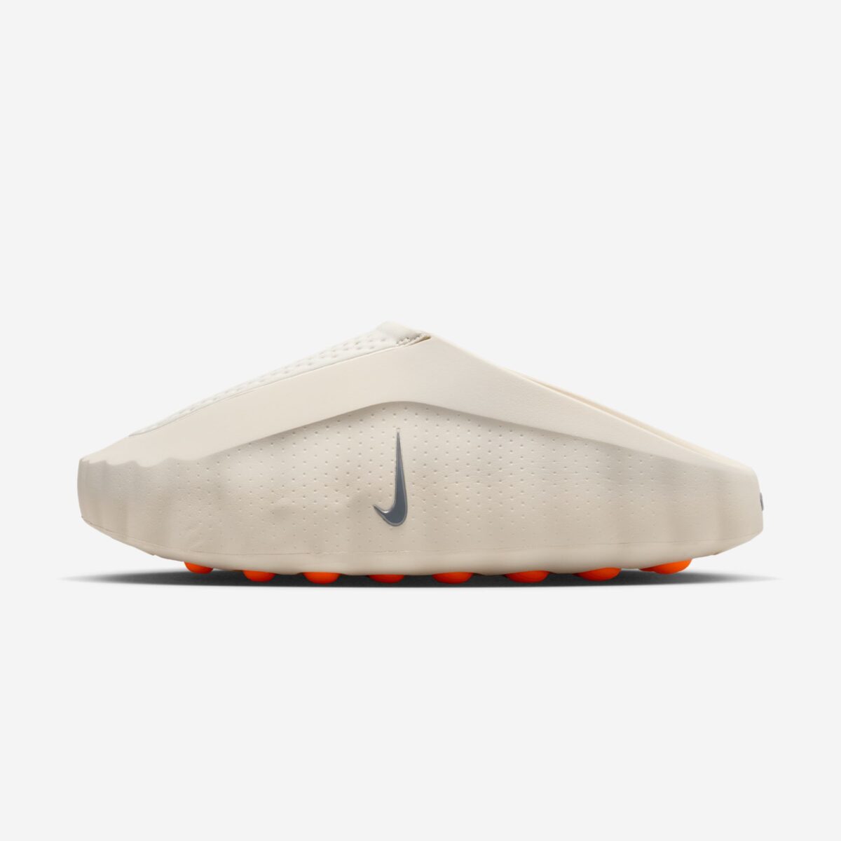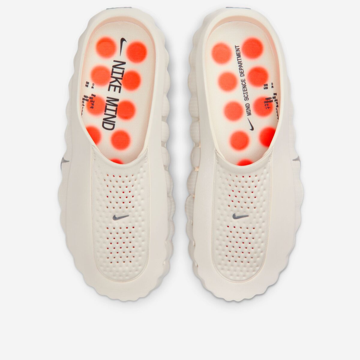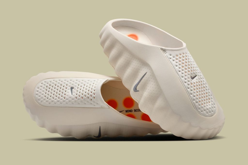 Силуэт Nike Mind 001 выполнен в формате слип-она (мула) с открытой пяткой, что подчёркивает его назначение — быстрое надевание и комфорт. Модель идеально подходит для использования до тренировки (pre-game) для настройки фокуса и после неё (post-game) для эффективного расслабления и восстановления. Верх изготовлен из формованной пены с уникальной «мятой» текстурой, что придает ему скульптурный и футуристичный вид. Перфорированные вставки обеспечивают вентиляцию и гибкость, делая обувь максимально удобной для повседневного ношения.