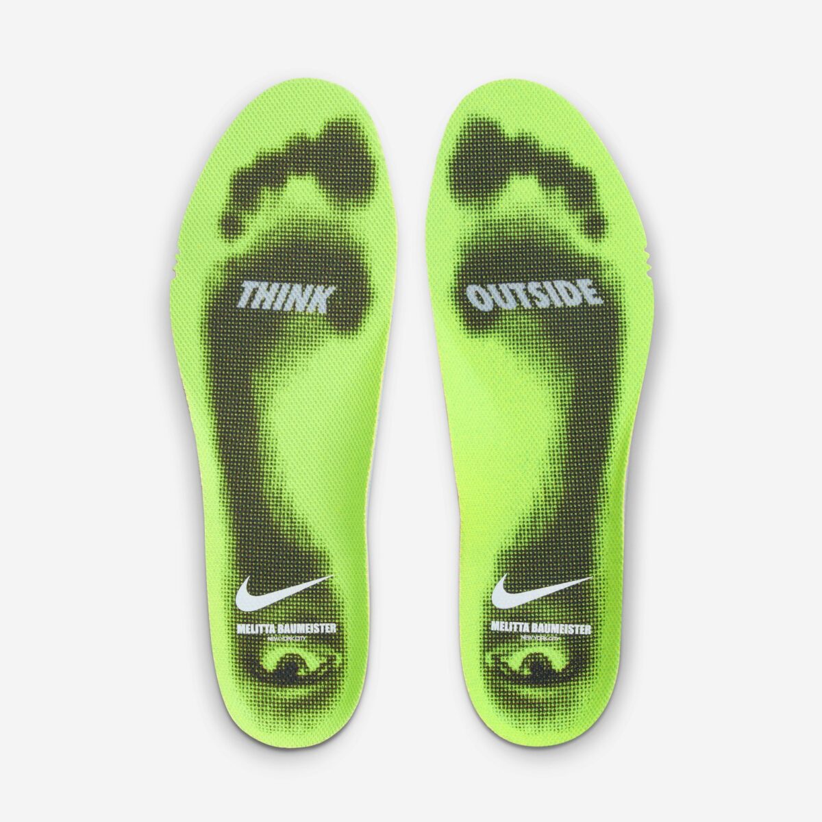 Внешний вид модели под кодовым названием “Volt” моментально привлекает внимание благодаря использованию спрей-финиша (sprayed finish) и смелых графических элементов по всей поверхности кроссовка. Цветовая палитра Volt/Cyber-Off White-Black создает яркий неоновый акцент, который эффектно контрастирует с черными деталями. Баумейстер удалось сохранить узнаваемый силуэт Nike, дополнив его уникальной текстурной отделкой, которая подчеркивает индивидуальность и авангардный стиль коллекции.