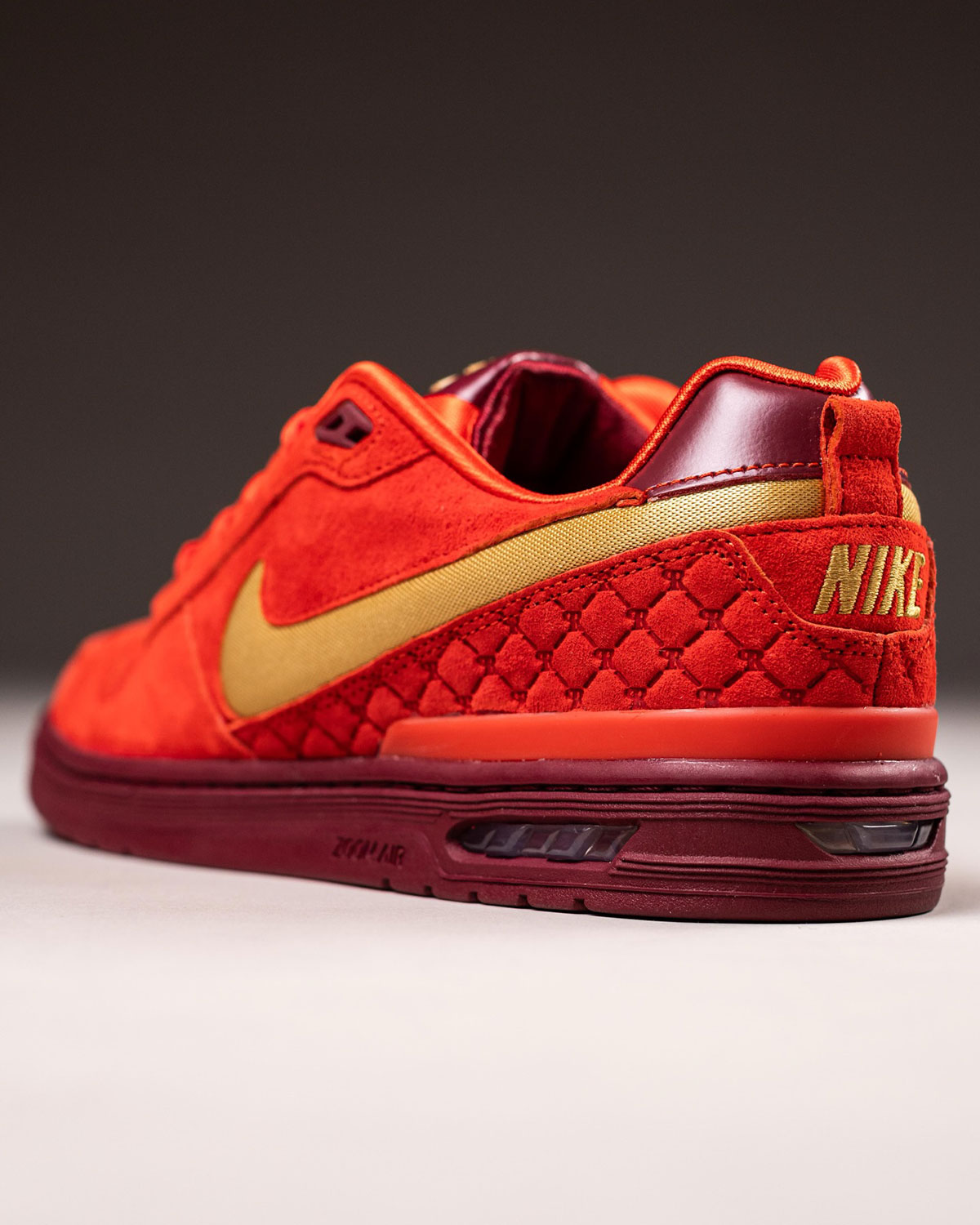 Верх пары выполнен из высококачественной замши в оттенке Habanero Red, что гарантирует долговечность при интенсивном катании. Особенностью модели стала квилтированная кожаная панель на пятке, которая не только добавляет премиального лоска, но и обеспечивает дополнительную защиту стопы. Золотистые логотипы Swoosh в цвете Club Gold создают эффектный контраст с глубоким красным фоном.