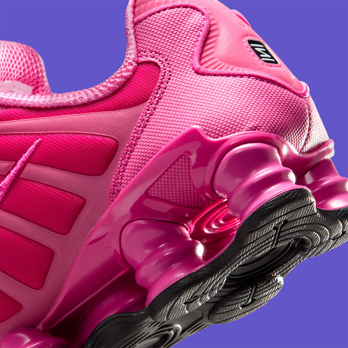 Главной отличительной чертой этой модели остается полноразмерная подошва с черными колоннами Shox. Эта технология, впервые представленная в 2003 году, обеспечивает уникальную механическую амортизацию и узнаваемый «пружинящий» эффект при ходьбе. Контраст ярко-розового верха и угольно-черной подошвы подчеркивает агрессивную геометрию кроссовок.