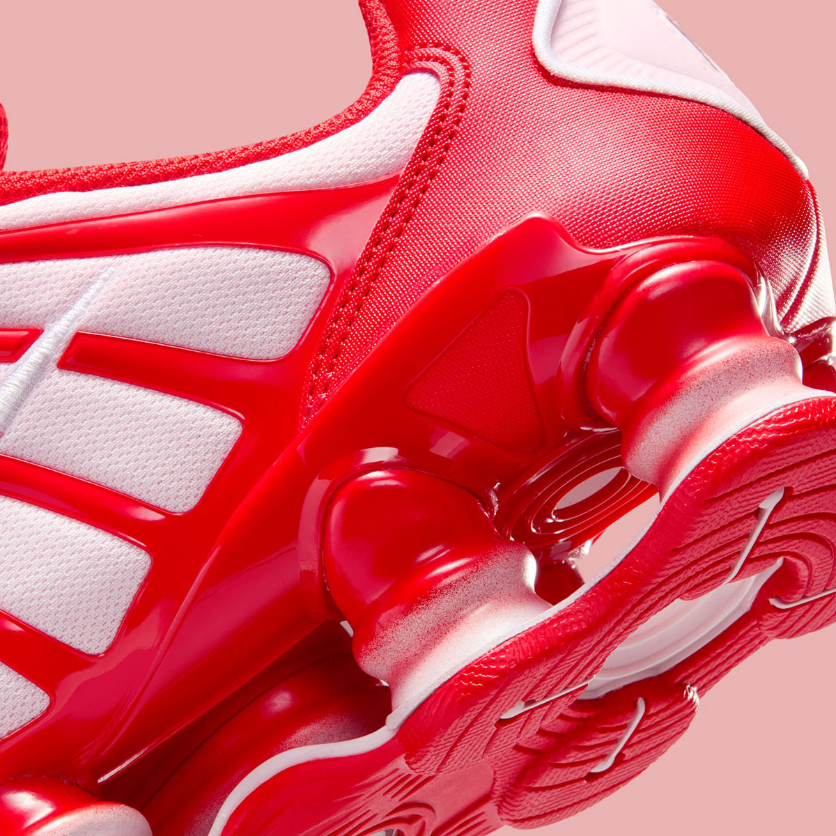 Центральная идея этой версии — игра на контрастах. Основа верха выполнена из дышащей сетки в мягком пастельном оттенке Pink Foam («Розовая пена»), который задаёт нежный и «конфетный» тон. На этом фоне ярко выделяются акценты цвета Habanero Red — сочного, огненно-красного. В этот цвет окрашены фирменный логотип Swoosh, элементы на заднике и, что самое главное, сами амортизирующие колонны Shox. Белые детали промежуточной подошвы гармонично балансируют палитру, делая образ завершённым и чистым.