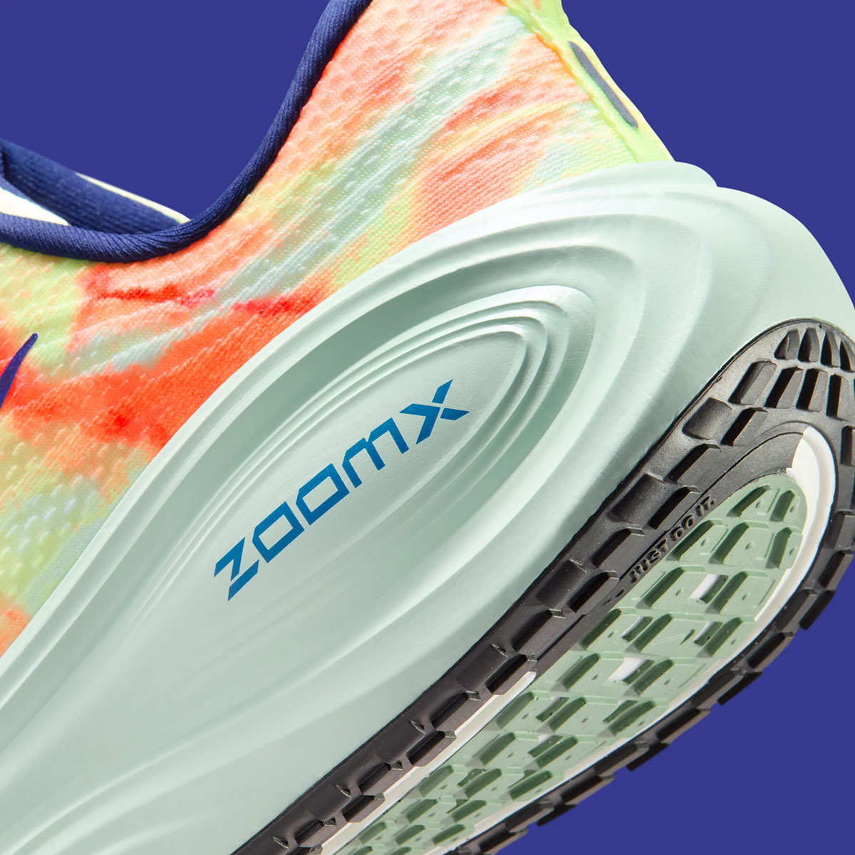 Основное внимание в новой итерации приковано к материалу верха — это усиленная инженерная сетка (reinforced mesh), дополненная синтетическими накладками. Визуальная составляющая выполнена в стиле «контролируемого хаоса»: мраморный принт объединяет в себе оттенки Barely Volt, Hot Lava и Blue Void. Отсутствие четкого графического паттерна придает каждой паре индивидуальный вид, а глубокий темно-синий цвет Indigo Burst на шнурках и логотипе Swoosh служит надежным визуальным якорем, уравновешивающим яркую палитру.