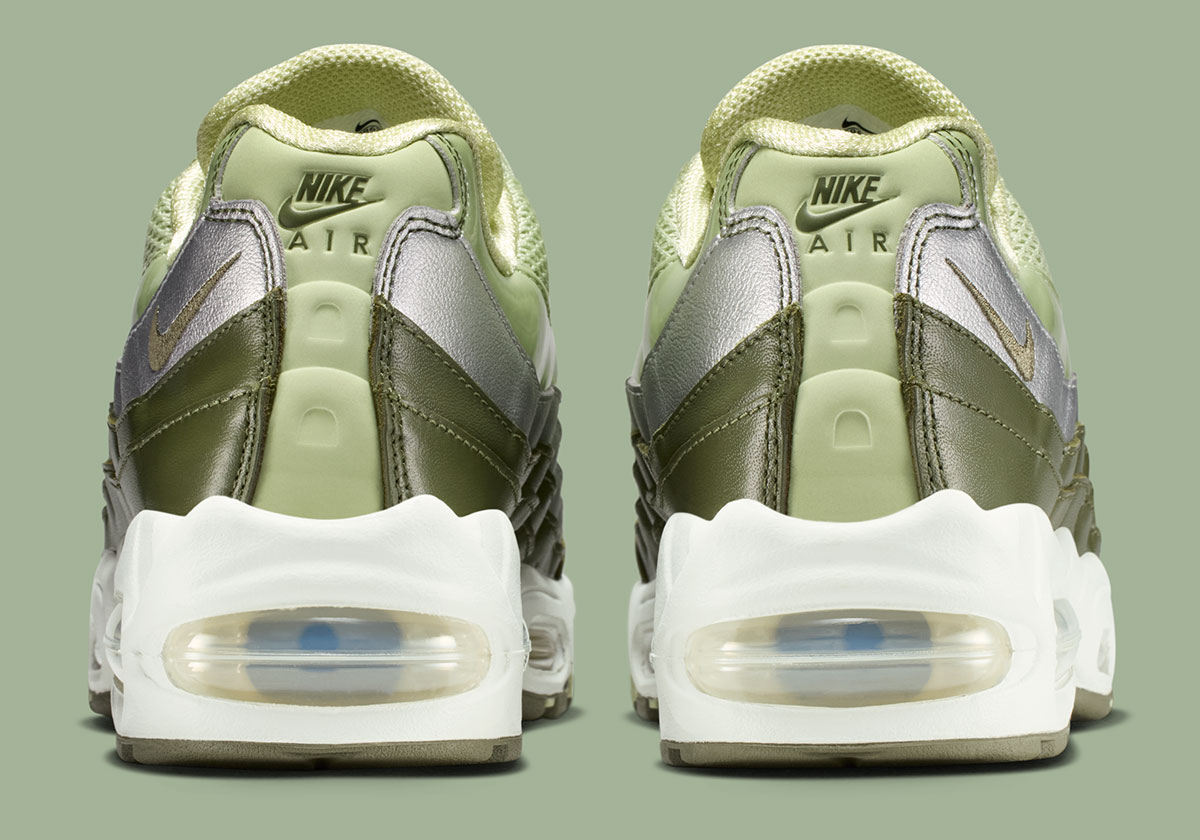 Цветовое решение модели выстроено вокруг сложной градации оливковых оттенков. Дизайнеры использовали многослойную конструкцию «волн», где нежные тона Olive Aura и Spruce Aura плавно переходят в насыщенный Medium Olive. Этот природный милитари-градиент эффектно разрывается ярким визуальным акцентом — полосой из серебристой металлизированной кожи с «жатой» текстурой (crinkle leather). Такой контраст между матовыми оливковыми панелями и холодным блеском металла придает кроссовкам футуристичный вид, выделяя их на фоне стандартных кожаных релизов.
