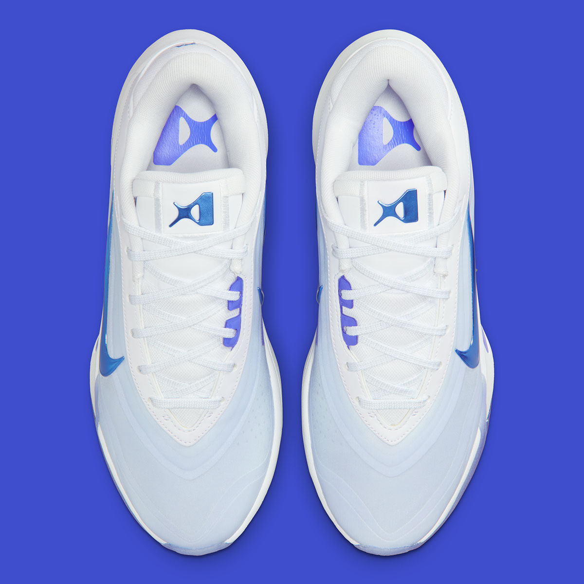 Верх пары выполнен из комбинации многослойных дышащих материалов и премиальной кожи на шнуровке и пятке, что гарантирует идеальный баланс между легкостью и структурной поддержкой. Особое внимание привлекает градиентная TPU-вставка в межподошве, переходящая от глубокого синего к фиолетовому, и металлизированный логотип Swoosh. Ледяная синяя подошва завершает прохладный образ, делая кроссовки визуально легкими и динамичными.