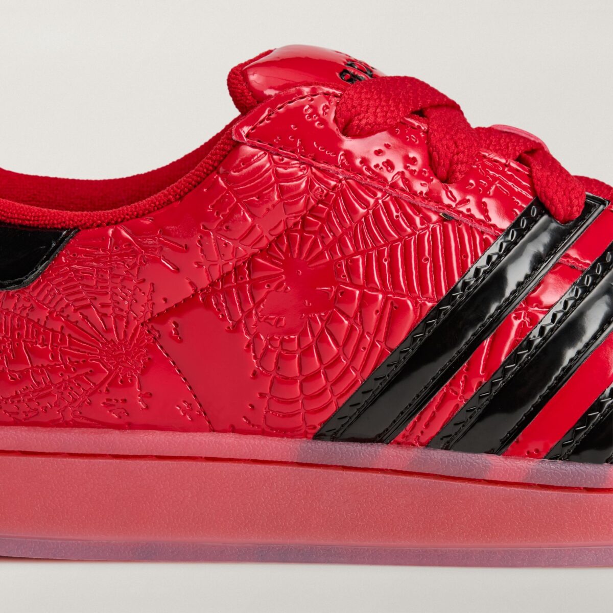 Основной акцент в новинке сделан на использовании премиальной патентной кожи ярко-красного цвета. Поверхность кроссовок украшена уникальным рельефным узором в виде паутины — визитной карточки SP5DER. Глянцевый блеск материала в сочетании с текстурным тиснением придает паре футуристичный вид, сохраняя при этом узнаваемые черты легендарных «ракушек».