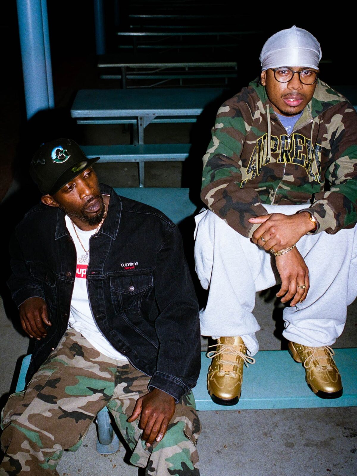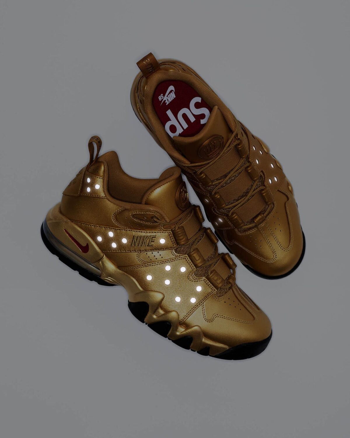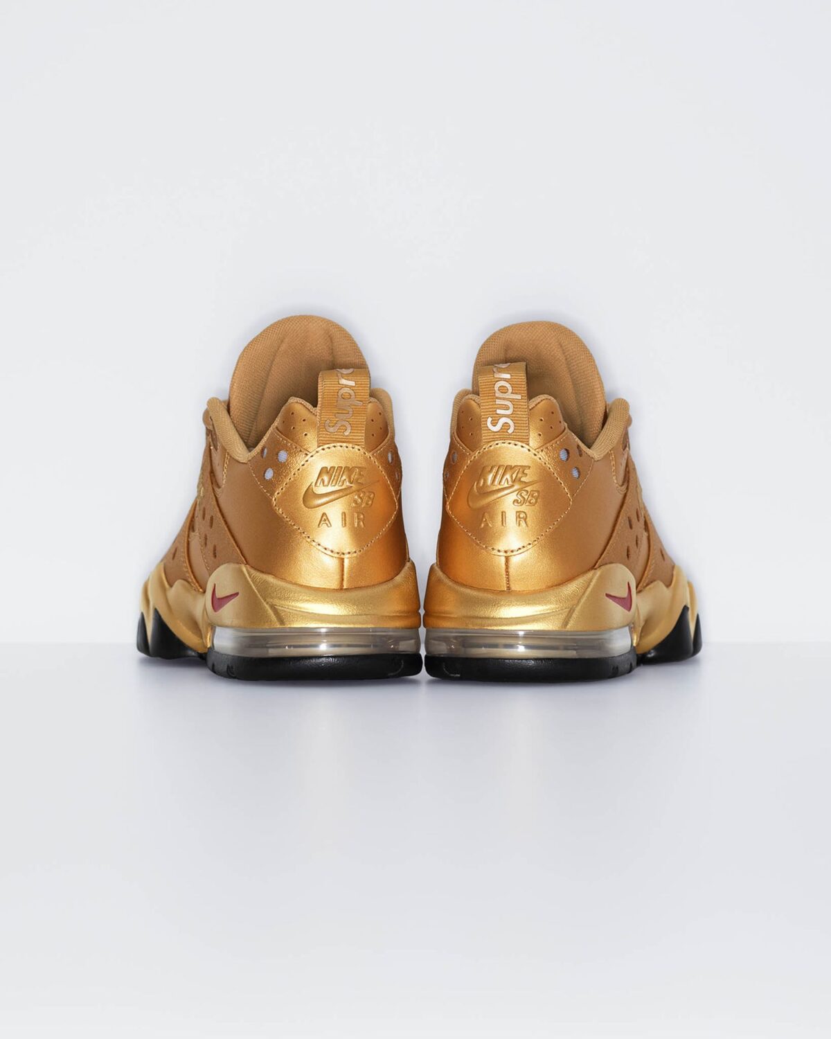 Supreme оставил свой след в каждой детали: фирменные логотипы расположены на язычках, стельках и задниках. Особое внимание уделено брендированной фурнитуре и подошве. В комплект к паре входят специальные двухбрендовые бирки (hangtags) и дополнительные шнурки, что позволяет владельцу кастомизировать внешний вид кроссовок под свой стиль.