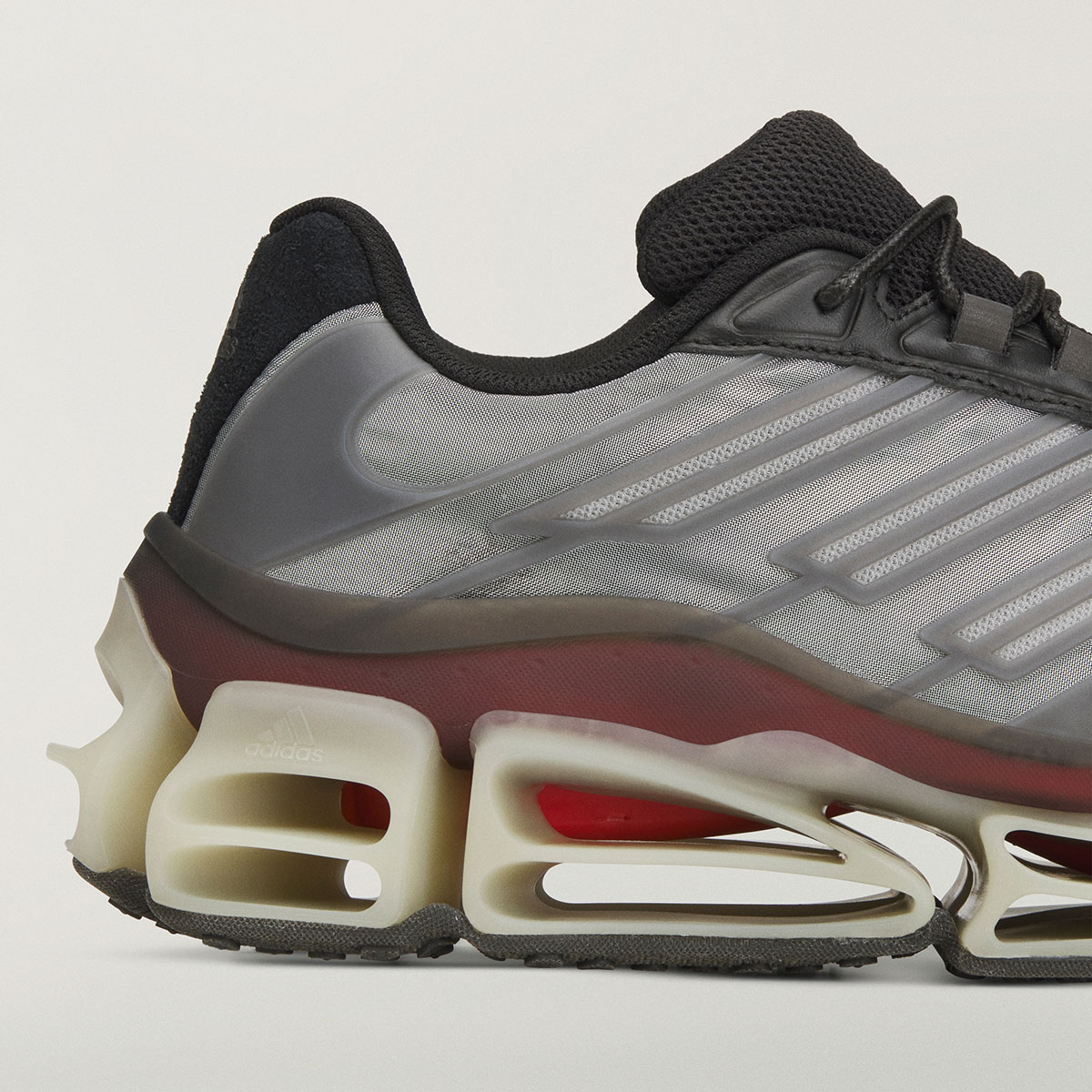 Верхняя часть кроссовка представляет собой сложную многослойную конструкцию. Основу составляет дышащая сетка, дополненная прозрачными TPU-оверлеями, которые формируют абстрактный силуэт знаменитых трех полосок. Использование замшевых панелей на носке и пятке придает паре необходимую глубину и долговечность, а серебряная металлическая сетка в версии Core Black создает хай-тек образ, идеально подходящий для темы космических путешествий.